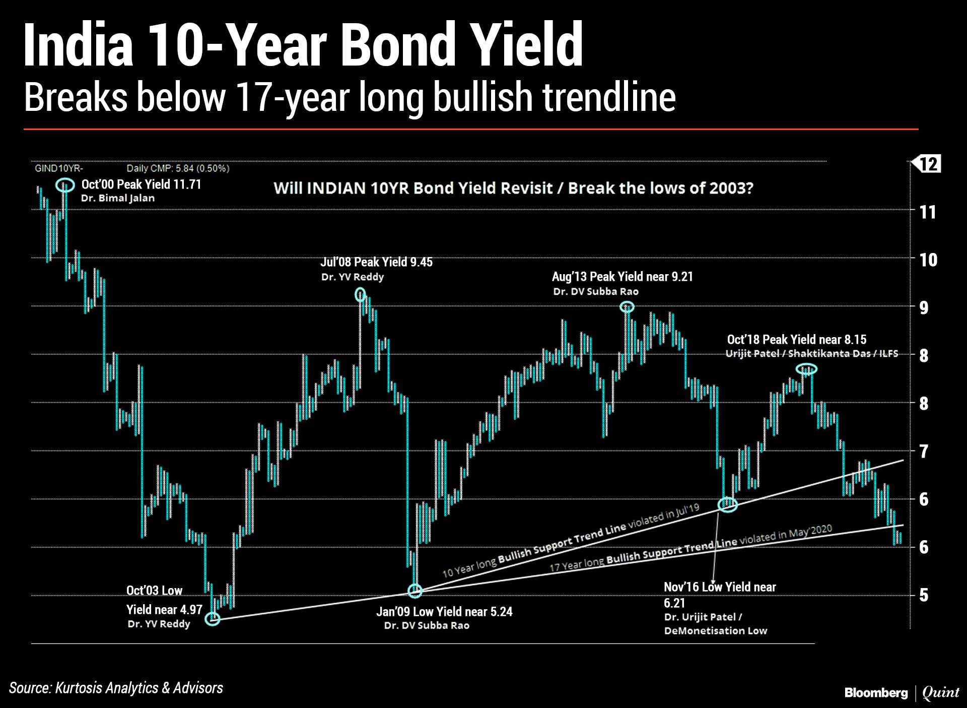 “The chart of India 10-year clearly indicates a possible retest of 2003 lows in yield terms after having broken below a 17-year bullish support trendline in May 2020,” Rao told BloombergQuint. “India 10-year bond yield was at sub-5% in October 2003 and so was the size of BFSI lending books, which has over 17 years grown massively.”