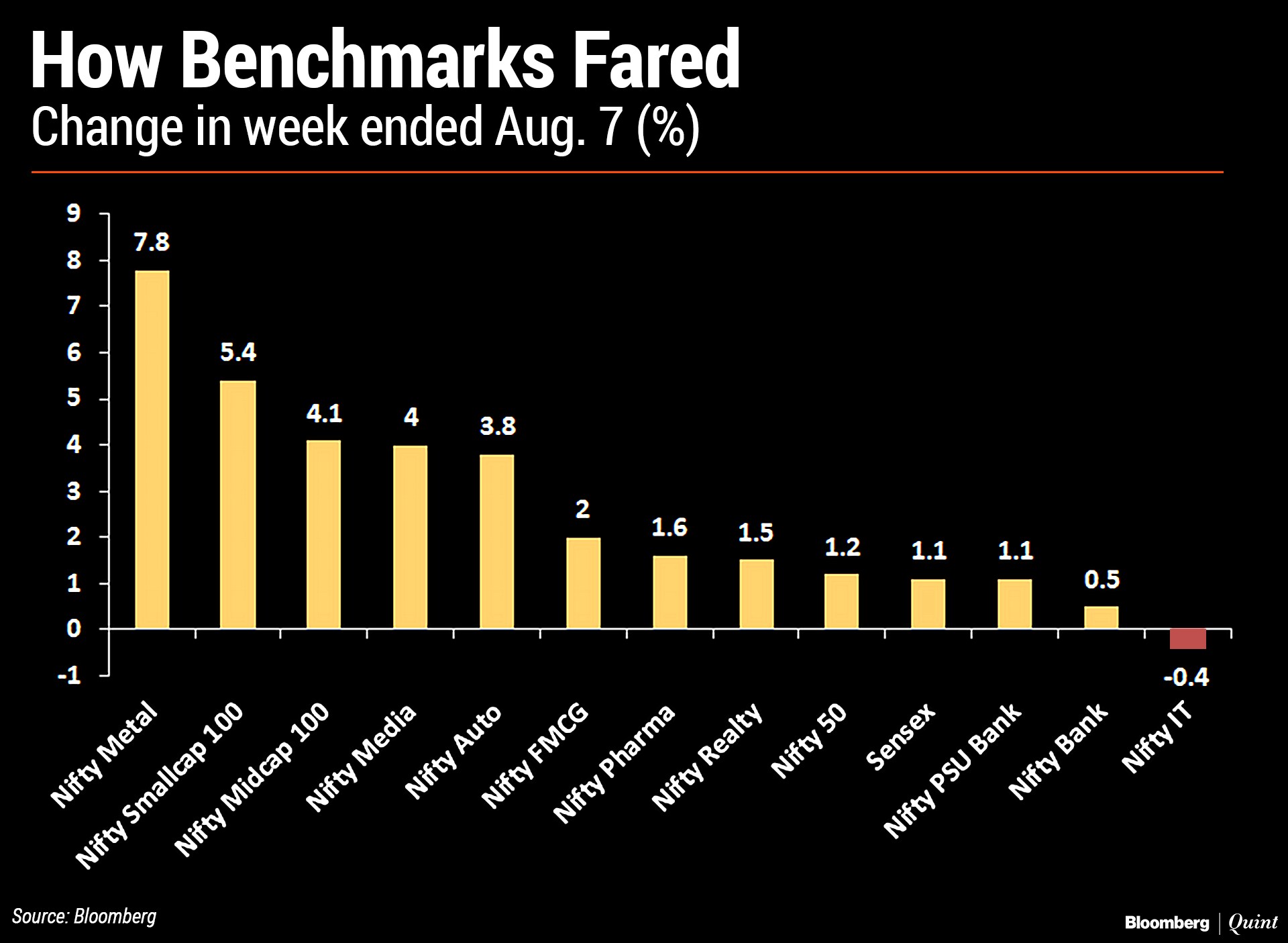 The S&P BSE Sensex and the Nifty 50 index advanced 1.1% and 1.2%, respectively, for the week. The broader markets outperformed the benchmark indices as Nifty mid- and small-cap indices jumped 4.1% and 5.4%, respectively. All sectoral gauges barring information technology ended higher.