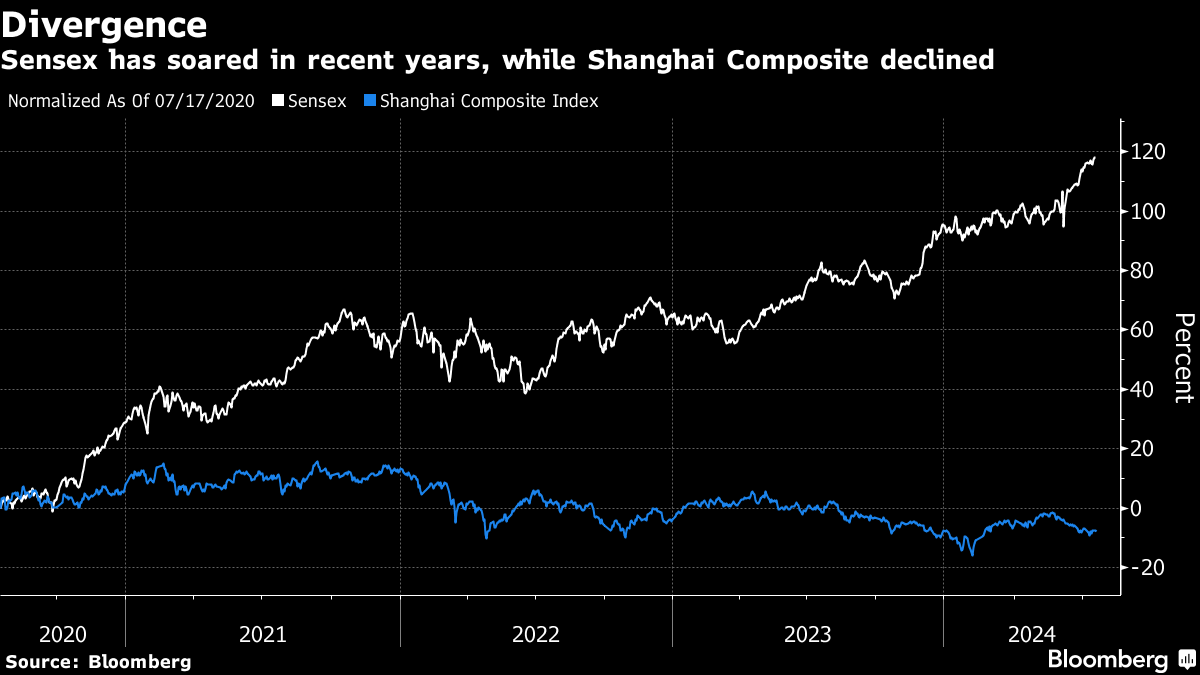 India is proving an attractive option for investors shifting away from China — the Sensex index is up more than 11% this year and 118% since 2020. The Shanghai Composite Index has slipped about 8% in that four-year period.