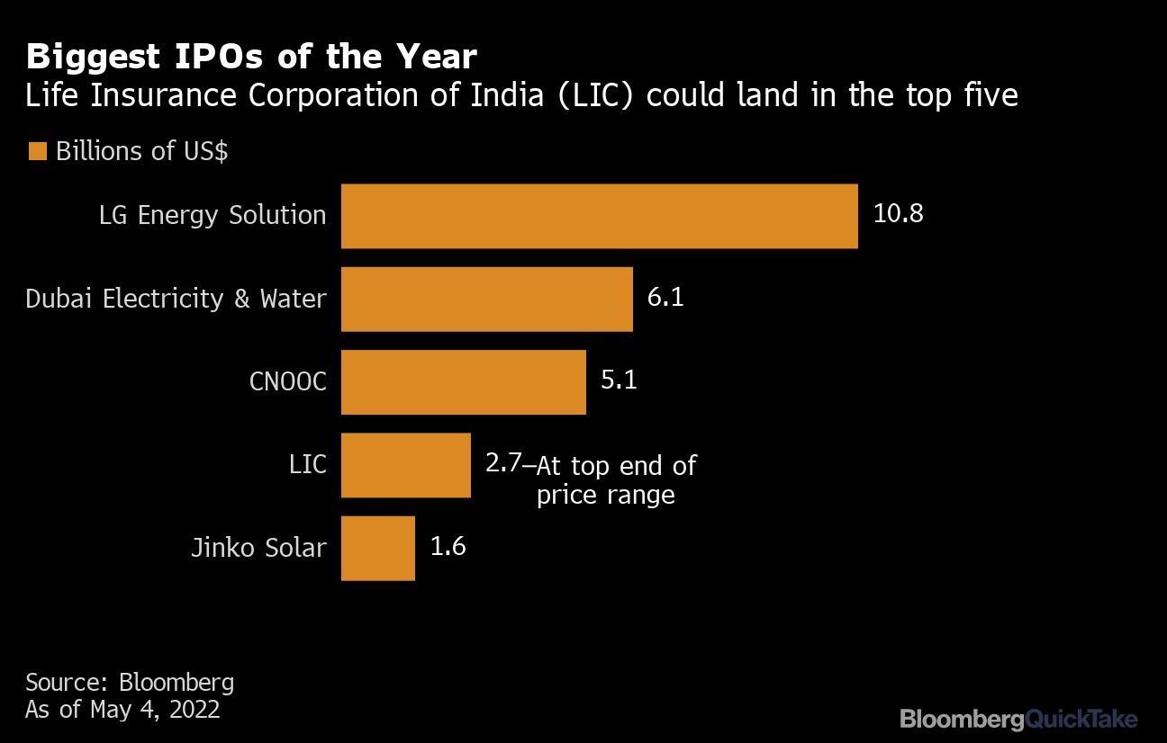 Besides smashing India's record as the country's biggest IPO, LIC's offering is also the world's fourth-biggest this year, according to data compiled by Bloomberg. LIC's debut comes at a time when capital-market activities have significantly slowed globally as the war in Ukraine stokes market volatility and saps investor appetite.