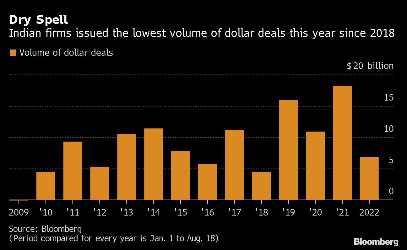“The fall in dollar issuances this year could be due to a sharp rise in dollar interest rates thus reducing the arbitrage with borrowing in India,” said Arvind Chari, the chief investment officer at Quantum Advisors Pvt. “The sharp depreciation in the rupee may also have postponed some fund raising plans.”