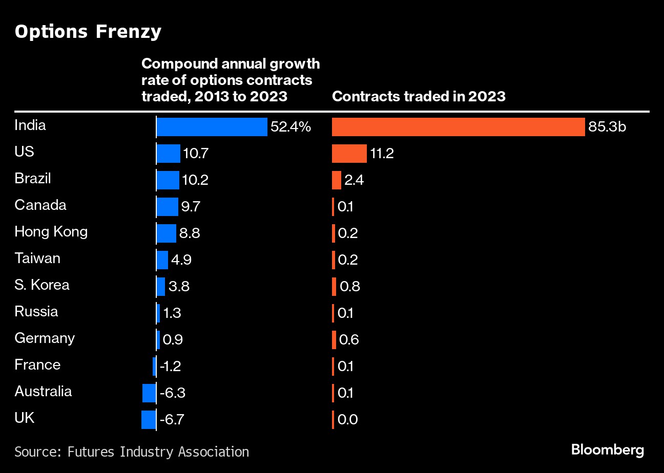 In 2023, Indian investors traded 85 billion options ­contracts, more than anywhere else in the world. The country has topped the charts since 2019, when it first overtook the US in the volume of annual trades. (The US still buys and sells the most by dollar value.)