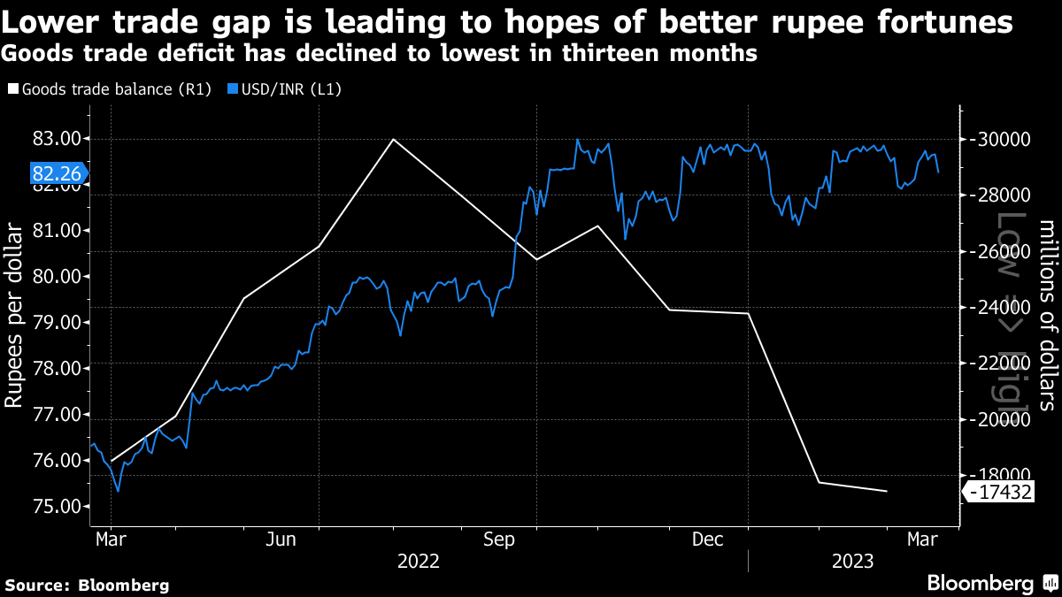 That's an added positive for the rupee, which along with Asian peers gained against the dollar after a dovish interest-rate hike by the Federal Reserve. The rupee was up 0.2% to 82.30 to a dollar on Monday.