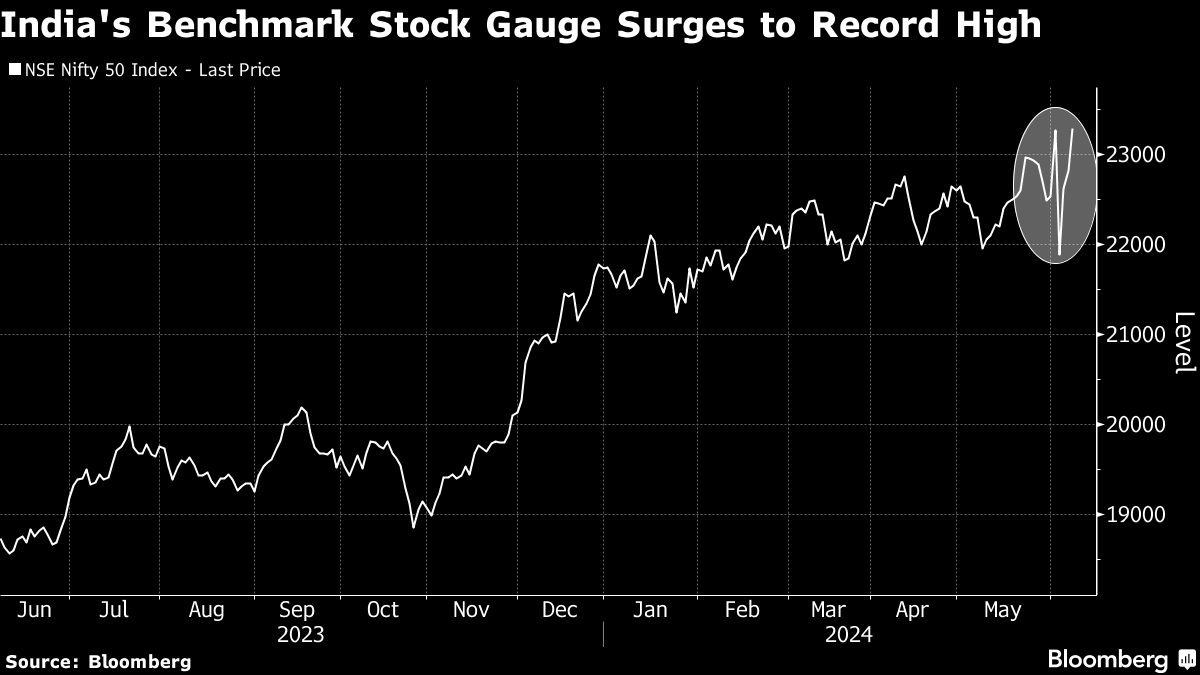 (Bloomberg) -- Indian stocks surged to a new all-time high, recouping losses from Tuesday's unexpected election result that triggered a record selloff in the world's fifth-largest equities market.