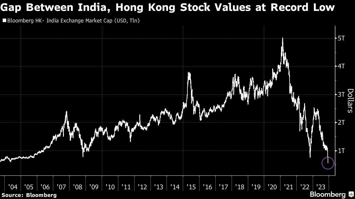 Already trading at all-time high levels, India's key stocks benchmarks have risen more than 13% this year and are headed for an unprecedented eighth-straight year of gains. In contrast, the key Hong Kong equity measure has fallen 17%, with the market's total value dropping to less than $4.7 trillion.