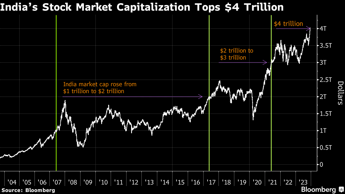 India's stock market value reached more than $4 trillion Tuesday for the first time, marking a key milestone for the world's fifth-biggest equity market as it rapidly narrows the gap with slumping Hong Kong.
