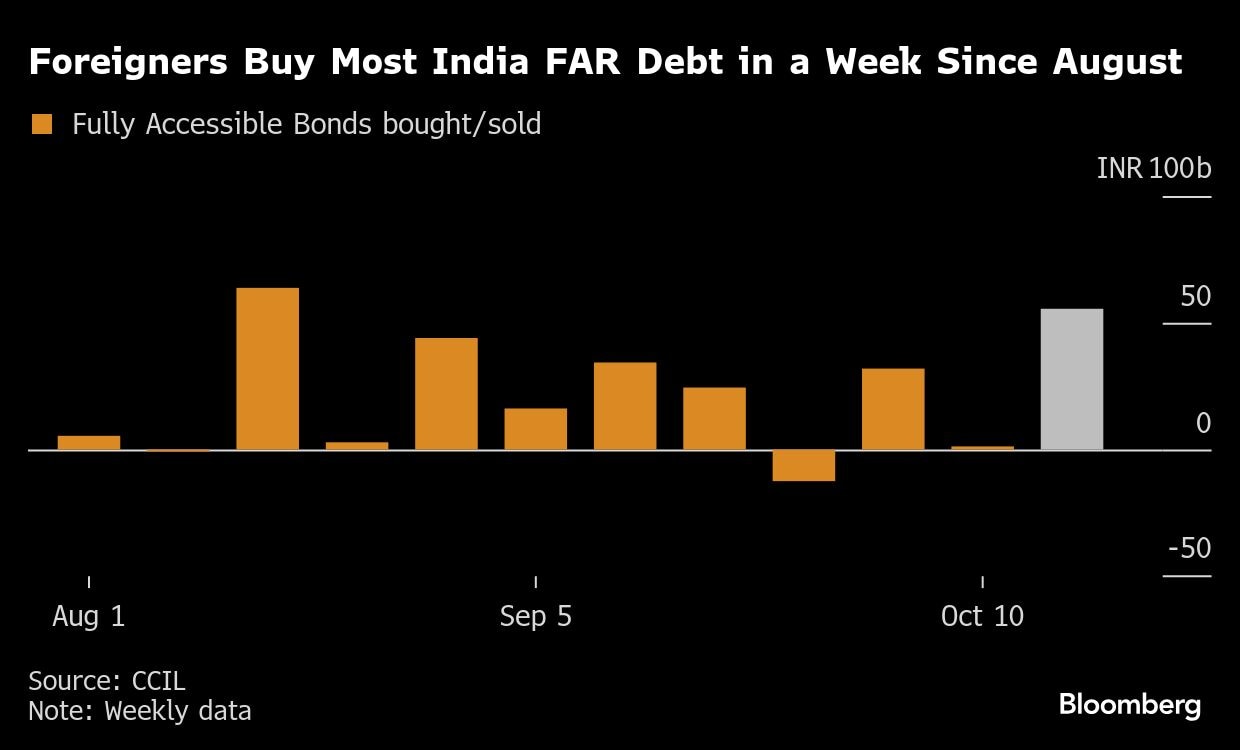 Global funds bought 55.51 billion rupees ($631 million) of debt accessible to foreigners last week, according to Clearing Corporation of India Ltd. data, compared with 1.21 billion rupees in the prior week. The currency surged nearly 1% last Wednesday after the Reserve Bank of India went on the offensive against rupee bears. The RBI sees the rupee under speculative attack and is prepared to intervene further until it settles at a stronger level, according to people familiar with the matter.