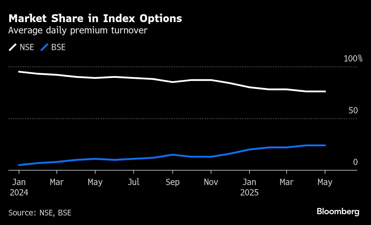 Derivatives trading accounts for a significant chunk of revenue for both exchanges, with India attracting global quantitative trading firms like Citadel and Jane Street. The NSE has seen a steady decline in its market share in the past year as the securities regulator culled highly traded weekly contracts such as the ones on the NSE Nifty Bank Index, prompting a shift toward options on the S&P BSE Sensex Index.
