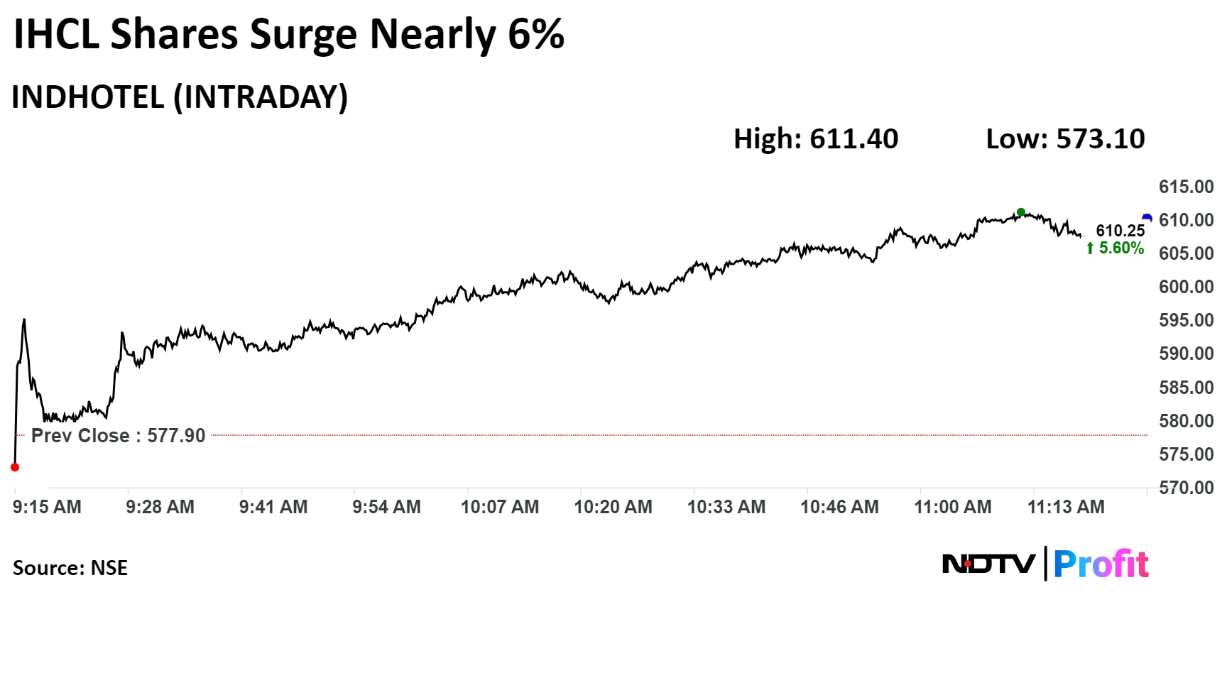 Shares of The Indian Hotels Co. rose as much as 5.68% during the day to Rs 610.75 apiece on the NSE. It was trading 5.09% higher at Rs 607.50 apiece, compared to a 0.03% decline in the benchmark NSE Nifty 50 as of 11:24 a.m.