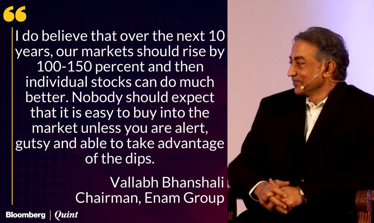 Veteran investor and chairman of the Enam Group, Vallabh Bhanshali, sees the Indian equity market rising by as much as 100-150 percent over the next 10 years.