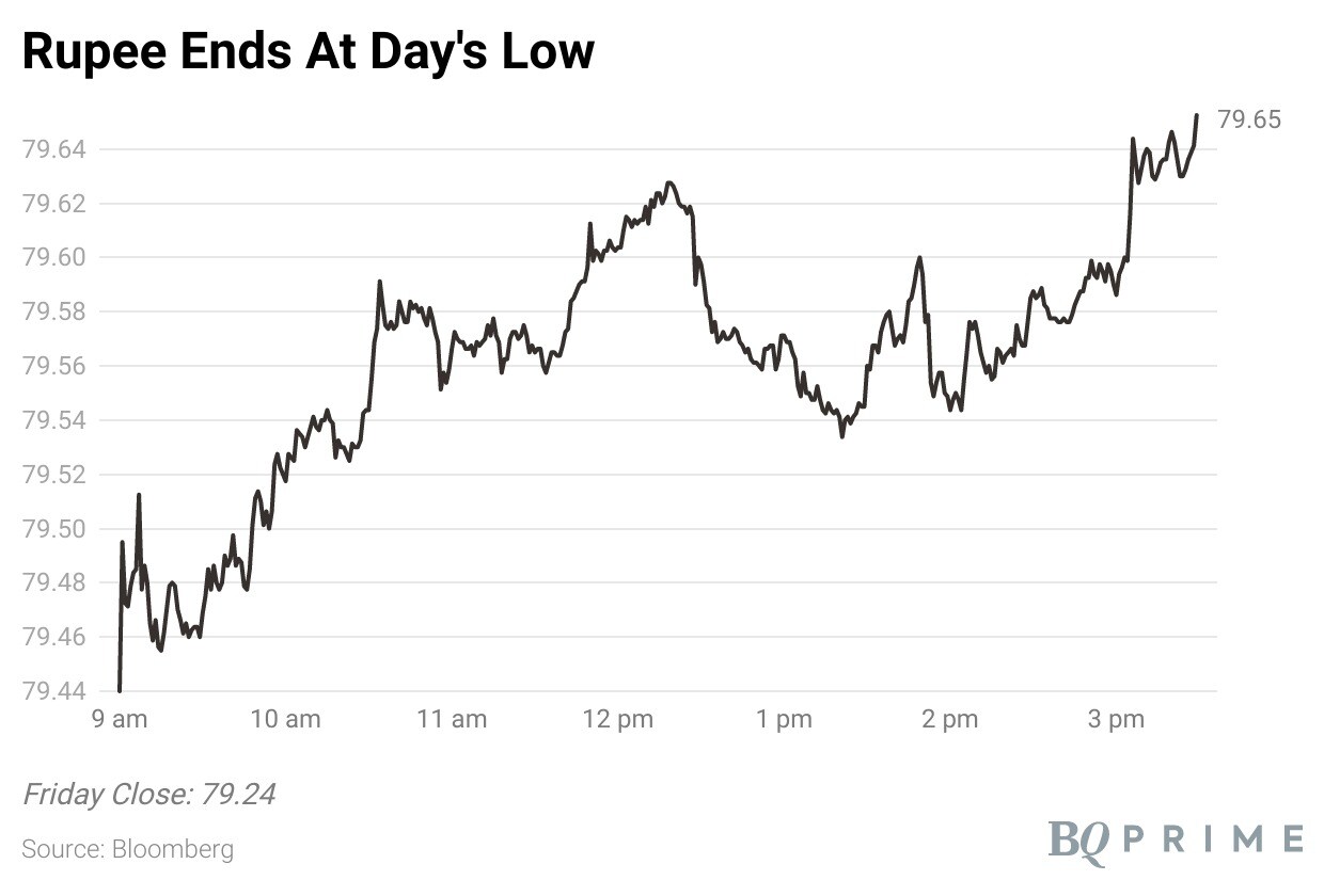 The domestic currency opened at 79.44 against the greenback, and then weakened as much as 40 paise to 79.65 at close.