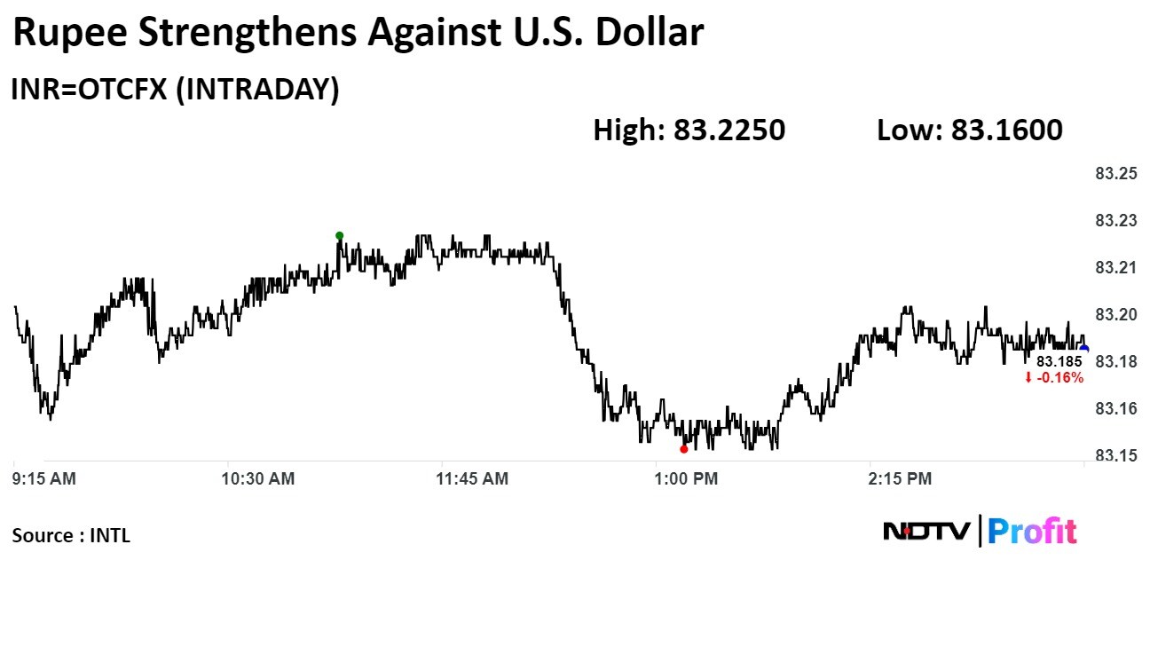 The local currency strengthened 13 paise to close at Rs 83.19 against the US dollar. It had closed at Rs 83.32 on Monday, according to Bloomberg data.