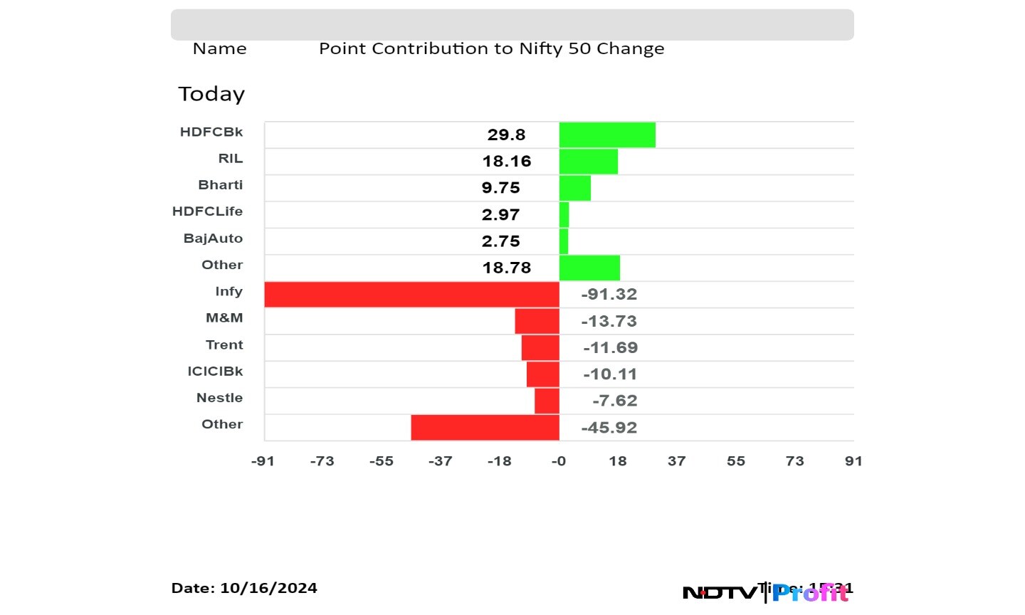 HDFC Bank Ltd., Reliance Industries Ltd., Bharti Airtel Ltd., HDFC Life Insurance Co. and Bajaj Auto Ltd. limited the losses to the index the most.