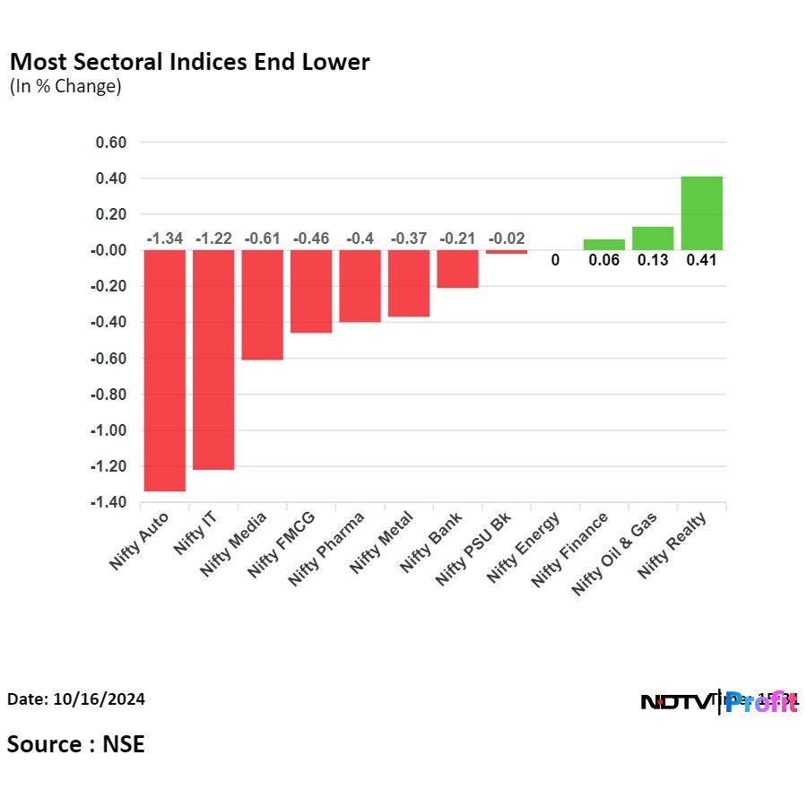 On the NSE, eight out of the 12 sectors declined, three advanced and one remained flat. The Nifty Auto index was the top loser, followed by the Nifty IT. The Nifty Realty rose the most, followed by the Nifty Oil & Gas.