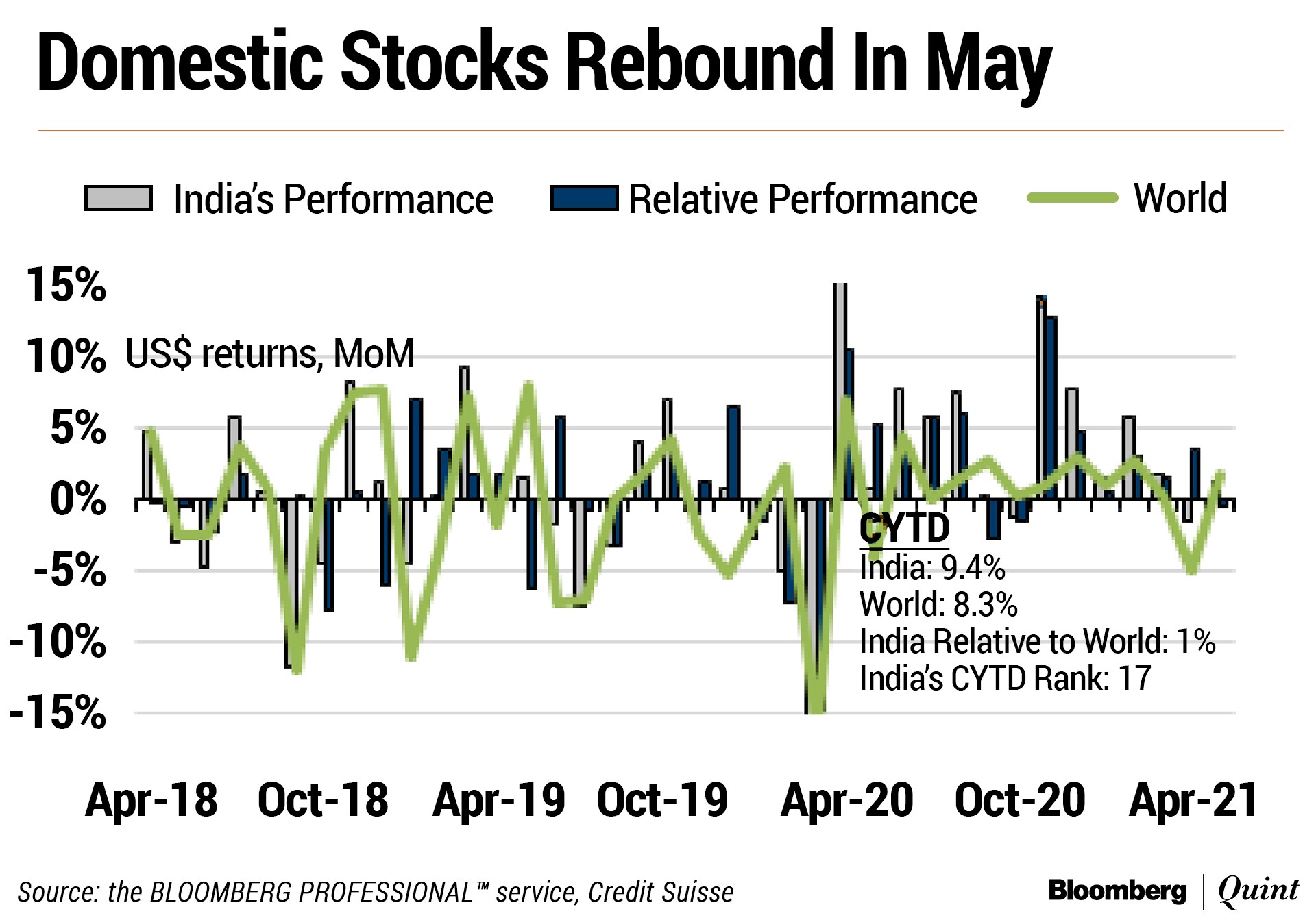 In April, the domestic stocks had underperformed global equities by 5% in U.S. dollars due to the emergence of intense second wave of the Covid-19 pandemic, while Indian equities have outperformed global peers by 1.8% so far this month, Credit Suisse said in a May 6 report. “India's total equity market capitalisation fell 1.4% in April, as compared to the 3.6% rise for the world.”