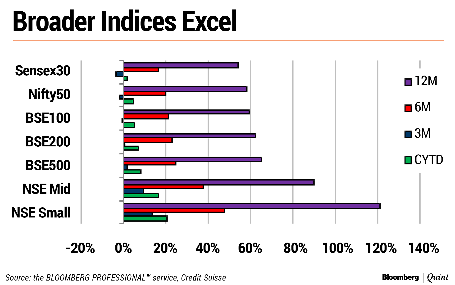 Within the market, the broader indices continue to do better than the narrower ones, according to Credit Suisse. The broader markets are more ‘local' in earnings exposure and more locally owned, and domestic savings get channelled there, the report said. Nifty has more foreign exposure but also more foreign ownership and may bounce harder as pandemic recedes, it said.