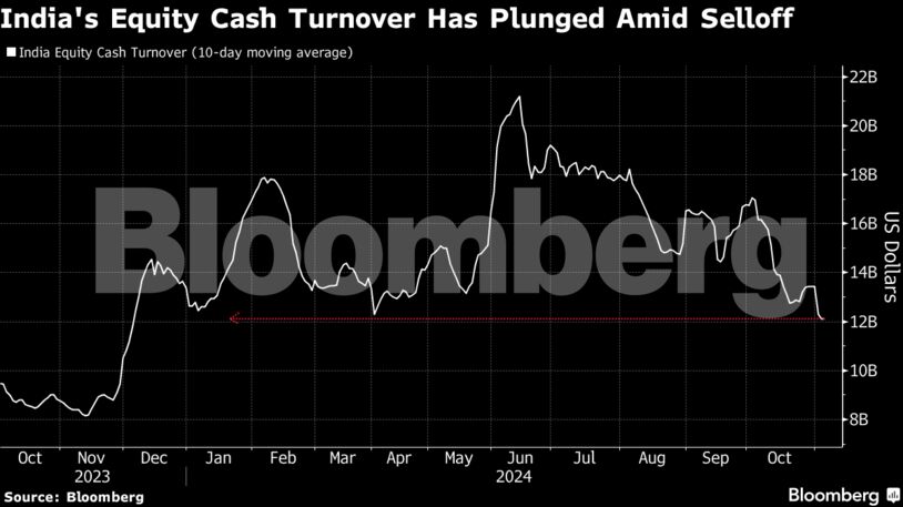 The 10-day moving average of the combined turnover on Indian exchanges dropped to about $12 billion on Wednesday, a value not seen since early December. The move came as the benchmark NSE Nifty 50 Index has fallen around 8% from its September peak, placing it close to a so-called technical correction of a 10% peak-to-trough decline.
