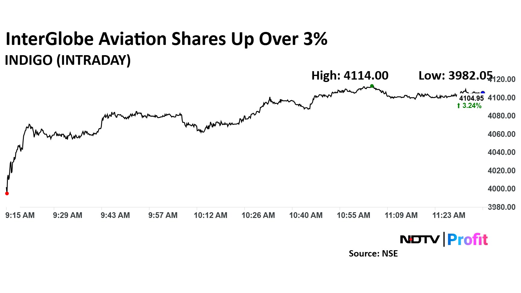IndiGo share price rose as much as 3.46% to Rs 4,114 apiece, the highest level since Oct. 30. It pared gains to trade 3.11% higher at Rs 4,100 apiece, as of 11:25 a.m. This compares to a 1.2% advance in the NSE Nifty 50 index.