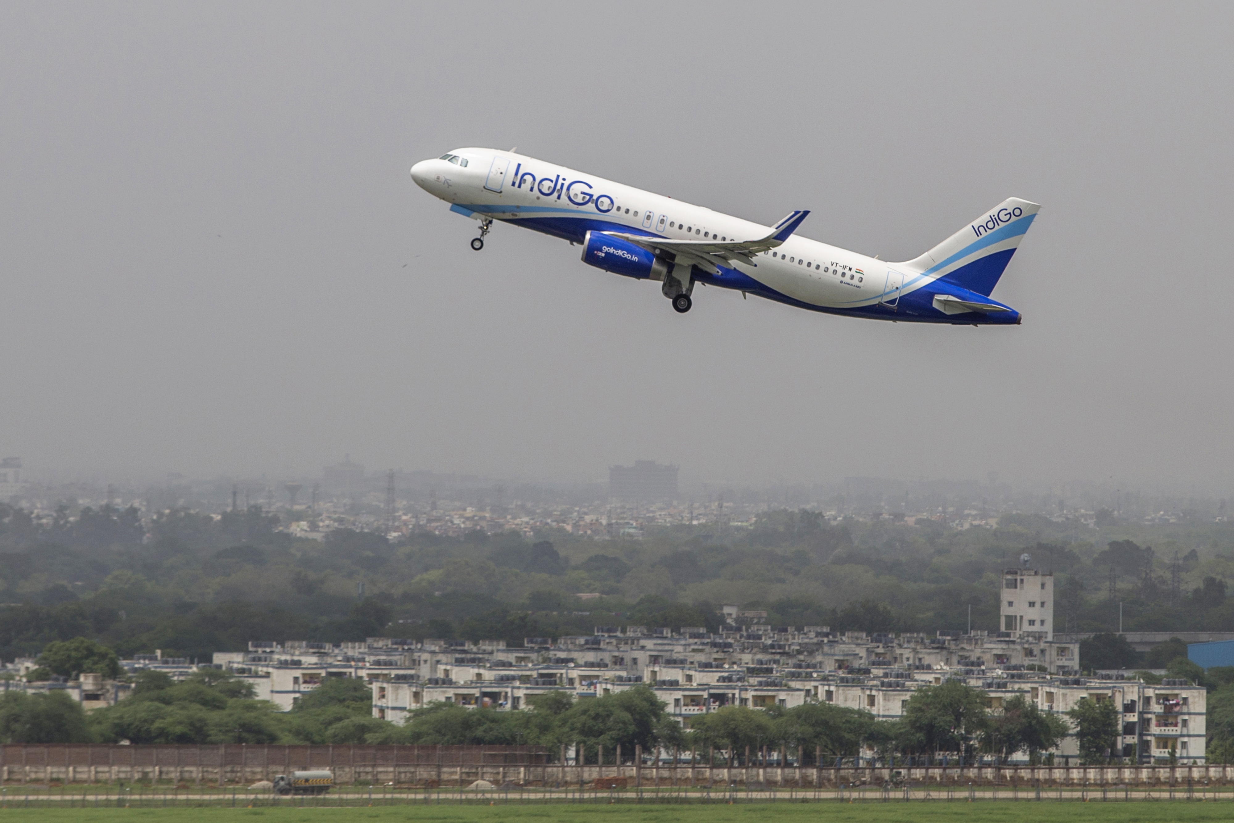 An aircraft operated by IndiGo is seen from a control tower as it takes off at Indira Gandhi International Airport in Delhi. (Photographer: Prashanth Vishwanathan/Bloomberg)