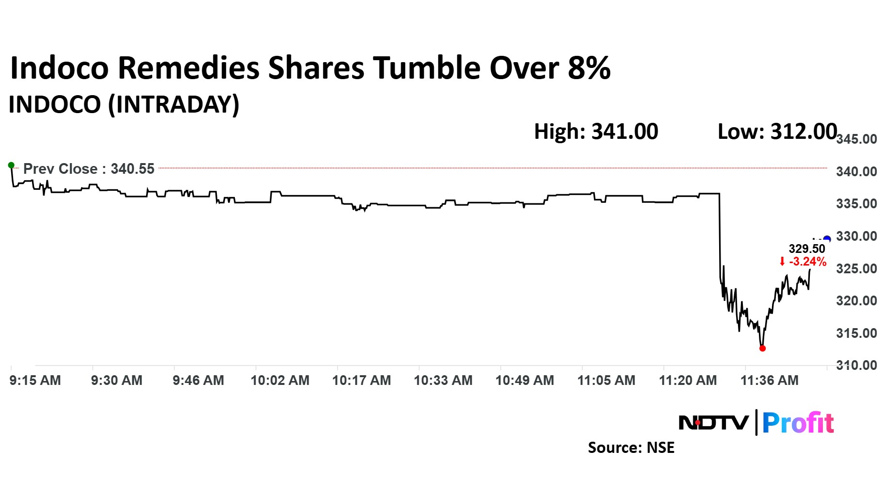 Indoco Remedies share price fell as much as 8.38% to Rs 312 apiece, the lowest level since Nov. 28, 2024. It pared losses to trade 3.92% lower at Rs 327.20 apiece, as of 11:53 a.m. This compares to a 1.01% decline in the NSE Nifty 50 Index.