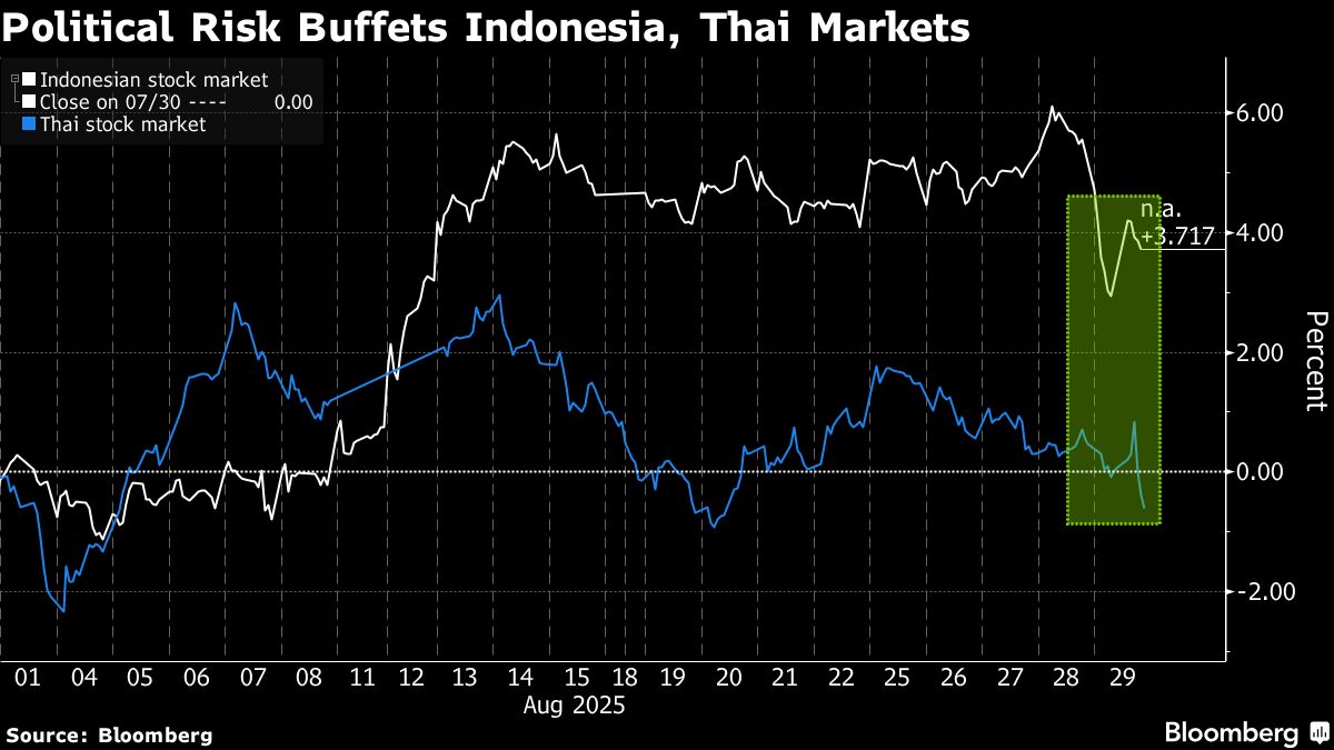 Intensifying protests in Indonesia and the latest leadership upheaval in Thailand are ratcheting up political risk in the two largest emerging stock markets in Southeast Asia.