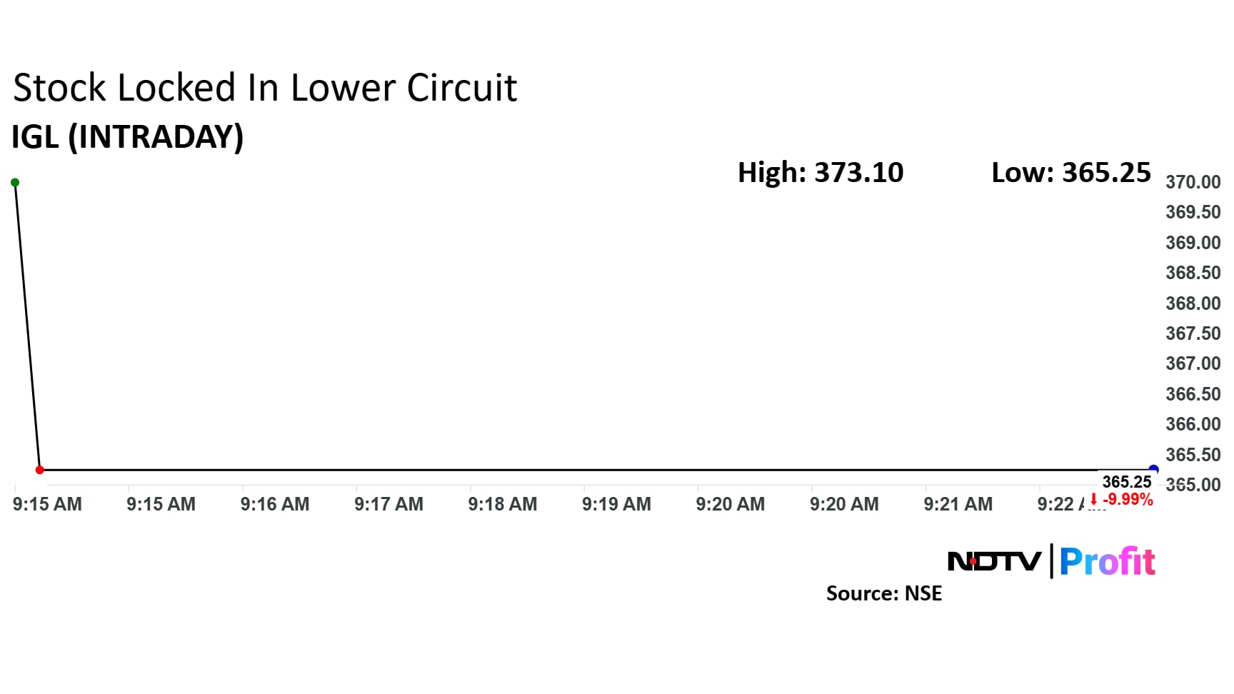 Shares of Indraprastha Gas fell as much as 9.99% to Rs 365 apiece. They were trading at the same level at 09:27 a.m., compared to a 0.21% decline in the NSE Nifty 50.