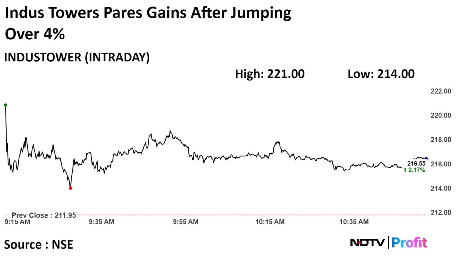 Shares of Indus rose as much as 4.27% during the day to Rs 221 apiece on the NSE. It was trading 1.77% higher at Rs 215.70 apiece, compared to a 0.01% advance in the benchmark Nifty 50 as of 10:37 a.m.