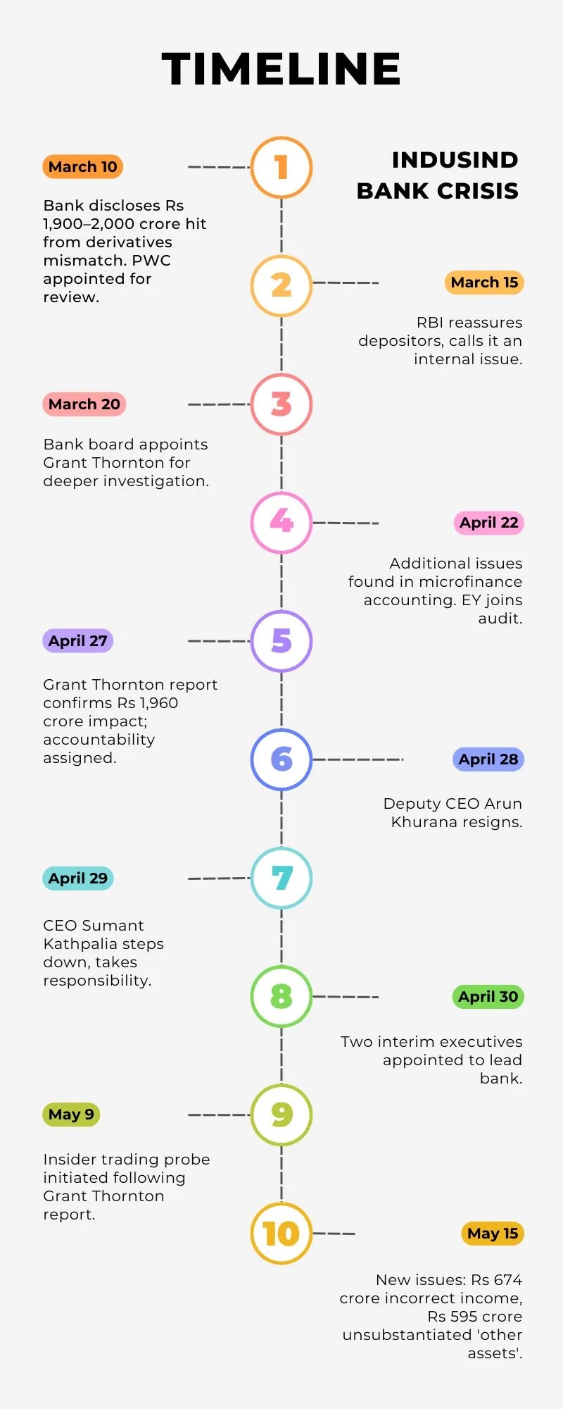 A timeline of IndusInd Bank crisis between March and May 2025. (Image: NDTV Profit)