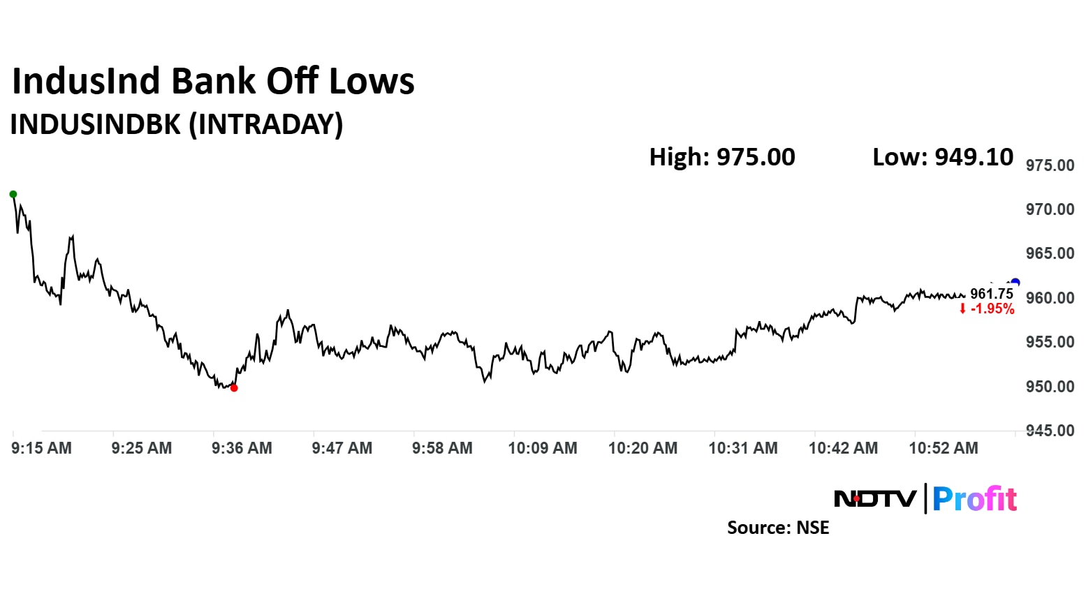 IndusInd Bank's share price fell 3.24% to Rs 949.10, the lowest level since Dec. 31. It pared loss to trade 1.93% down at Rs 962.00 apiece as of 11:05 a.m., as compared to a 0.26% decline in the NSE Nifty 50.