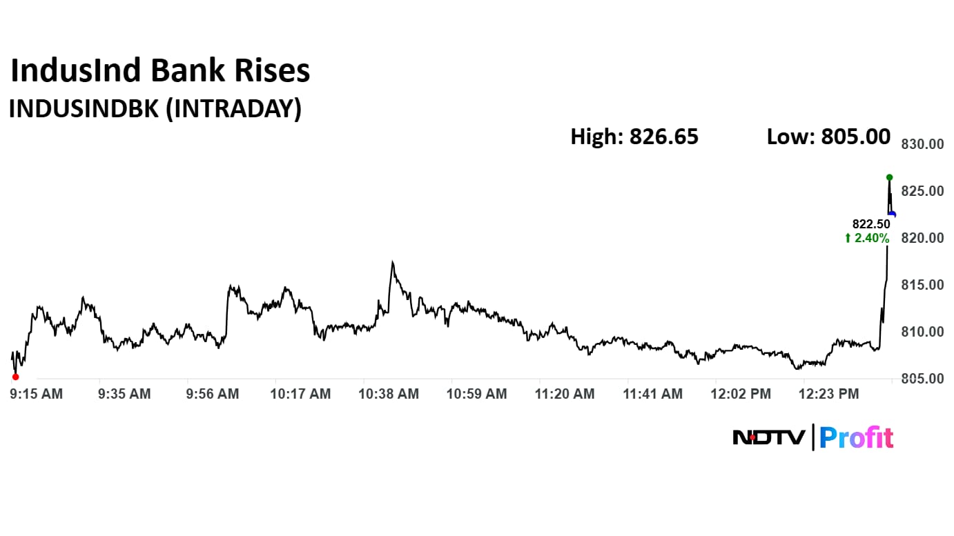 IndusInd Bank share price rose 4.91% to Rs 842.65 apiece, the highest level since May 12. The share price was trading 4.89% higher at Rs 842.25 apiece as of 1:10 p.m., as compared to a 0.89% advance in the NSE Nifty 50.