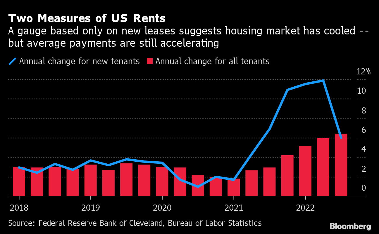 Real-time data suggest that the surge in rents and home prices is over now. But because of the way housing is captured in official inflation figures – which reflects the fact that rental prices are locked in over the span of a lease - there's typically a lag before the latest market conditions show up.