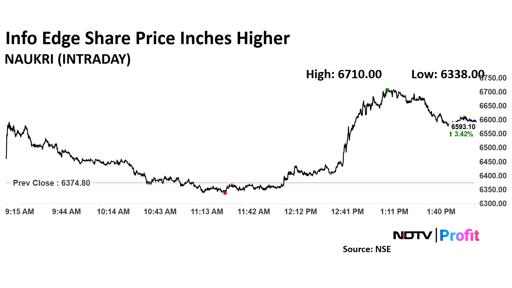 Shares of Info Edge rose as much as 5.26% to Rs 6,710 apiece. They pared gains to trade 4.08% higher at Rs 6,634.95 apiece, as of 01:45 p.m. This compares to a 1.76% advance in the NSE Nifty 50.