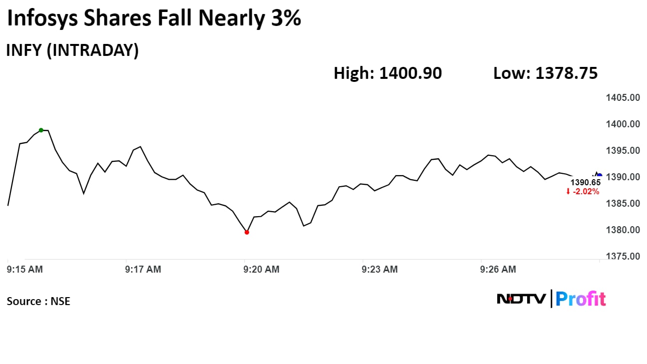Shares of Infosys Ltd. declined nearly 3% Friday after the tech giant's revenue declined in the fourth quarter and guided for a modest revenue increase in FY25.
