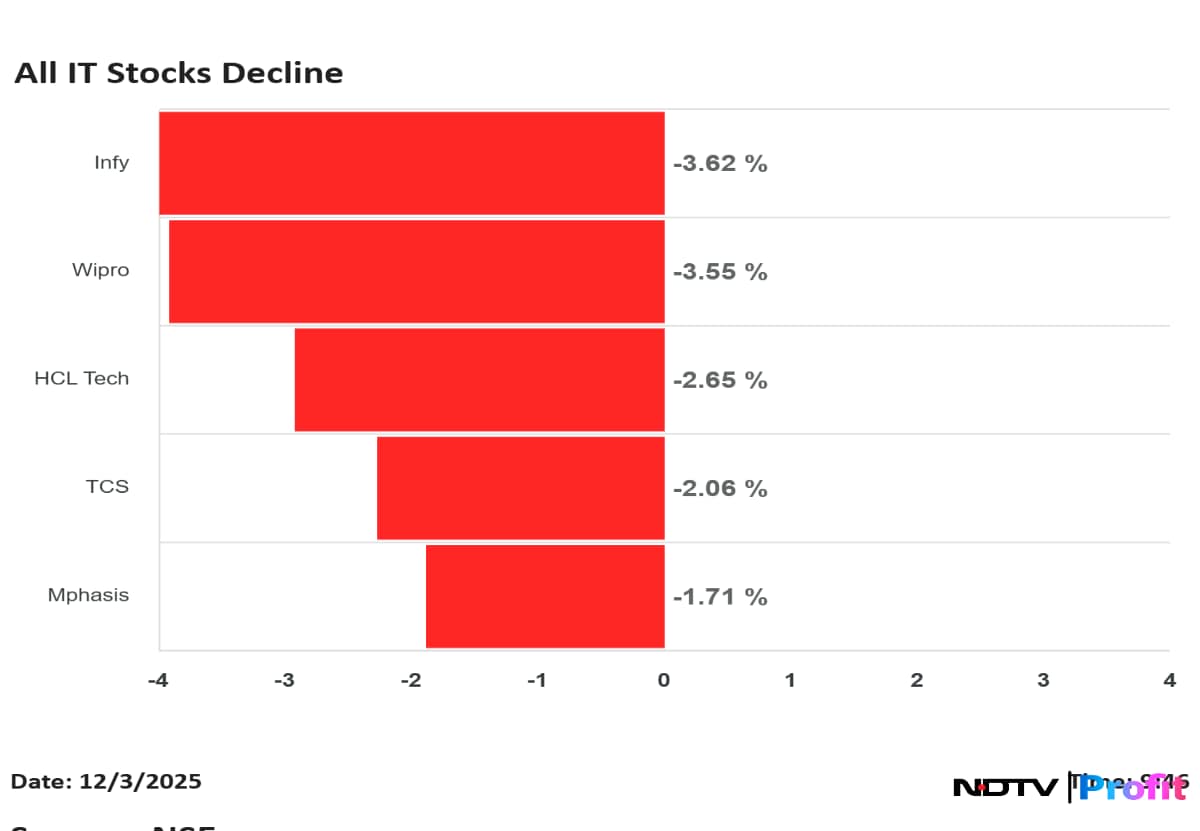 Wipro has fallen the most in the IT index with a decline of nearly 5%, followed by Infosys. HCLTech fell over 3% to Rs 1,514.05 apiece, while Persistent Systems Ltd. saw a 2.67% decline. Mphasis, TCS, Coforge and LTIMindtree also fell over 2% on Wednesday. Tech Mahindra, one of the brokerage's top picks, fell 1.82% to Rs 1,452.30 apiece.