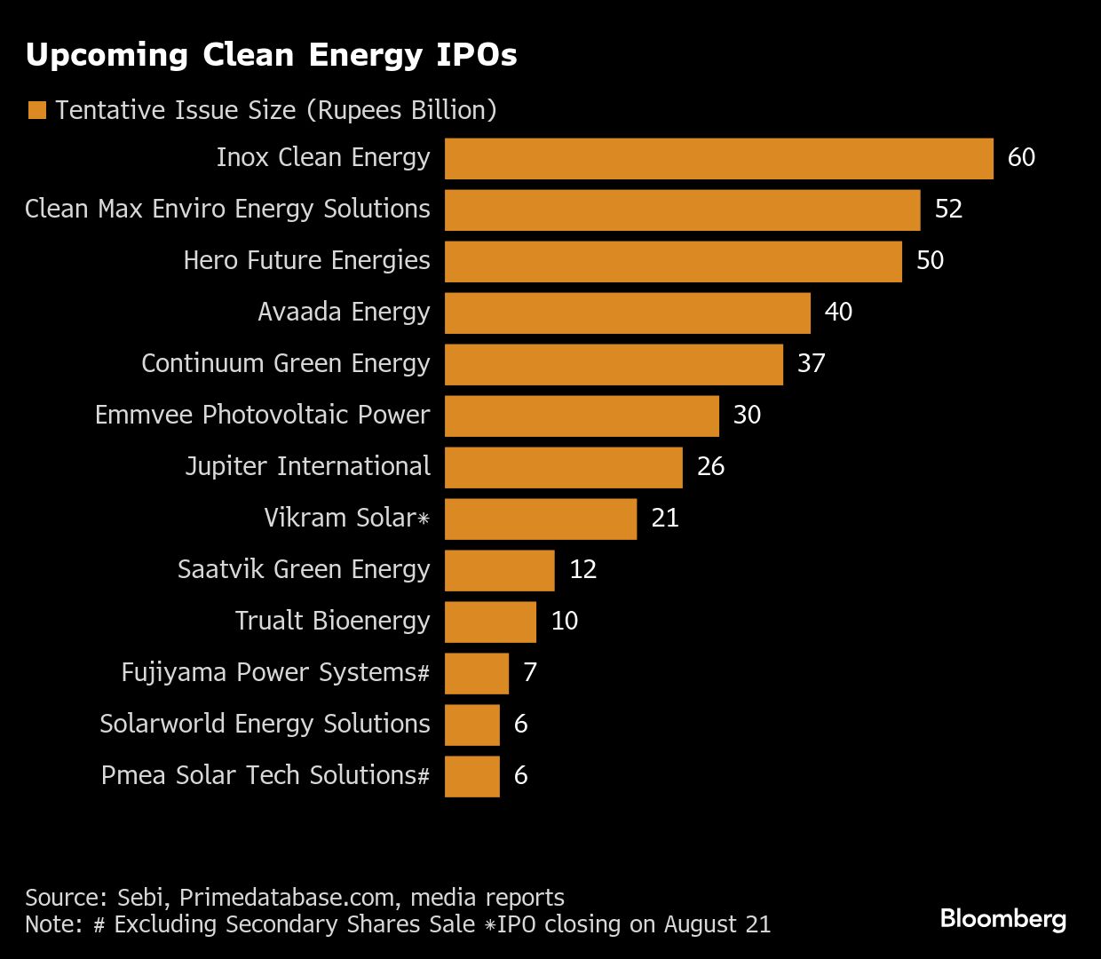 Vikram Solar closes its share sale this week, aiming to raise as much as 20.8 billion rupees ($239 million). Clean Max Enviro Energy Solutions Ltd has filed for an IPO this week, while the Securities and Exchange Board of India approved Fujiyama Power Systems Ltd.'s IPO plans in July. KKR & Co.-backed Hero Future Energies Ltd. has appointed bankers for a 50 billion rupee IPO, the Economic Times reported. The firms are part of a strong pipeline that may see shares listed over the coming year.