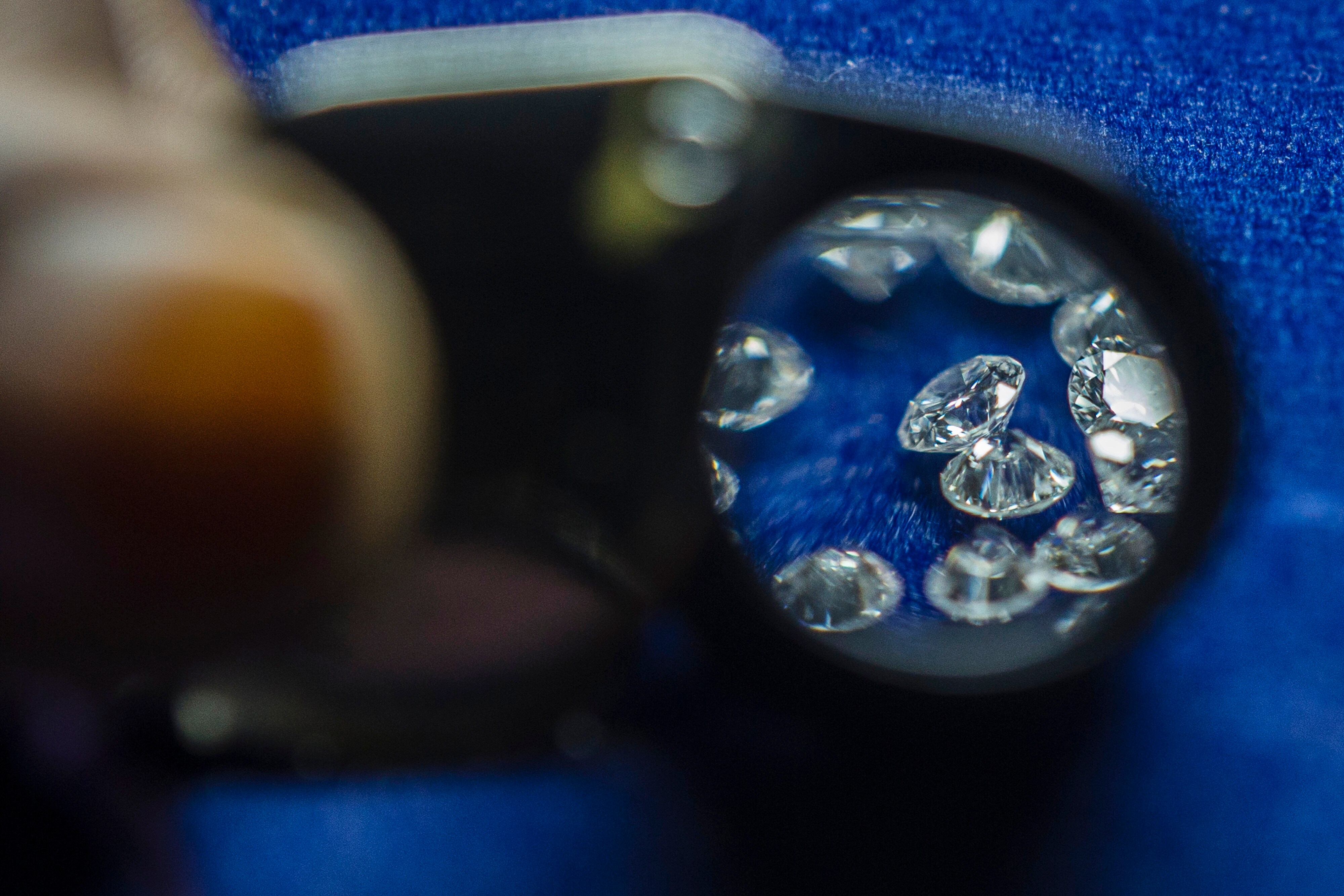 Cut and polished diamonds are seen through a loupe in an arranged photograph at a factory in Coimbatore, Tamil Nadu, India (Photographer: Prashanth Vishwanathan/Bloomberg)