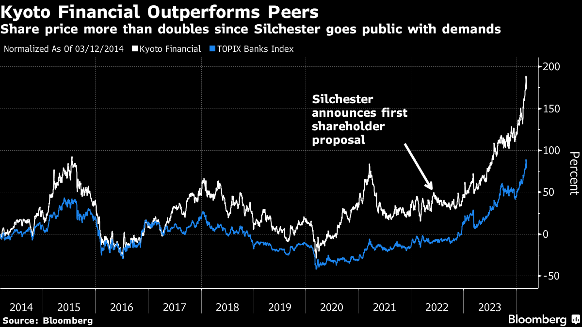 Kyoto Financial shares have more than doubled since Silchester announced plans to submit its first proposal in April 2022, another indication that vocal public stewardship can pay even when votes are lost. The money manager is the bank's largest shareholder with a 6.6% stake, according to data compiled by Bloomberg.