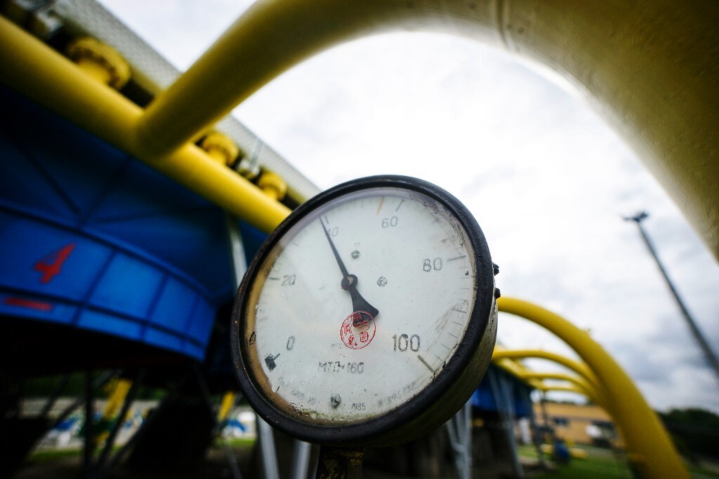 A pressure gauge sits on pipework at an underground gas storage facility (Photographer: Vincent Mundy/Bloomberg)