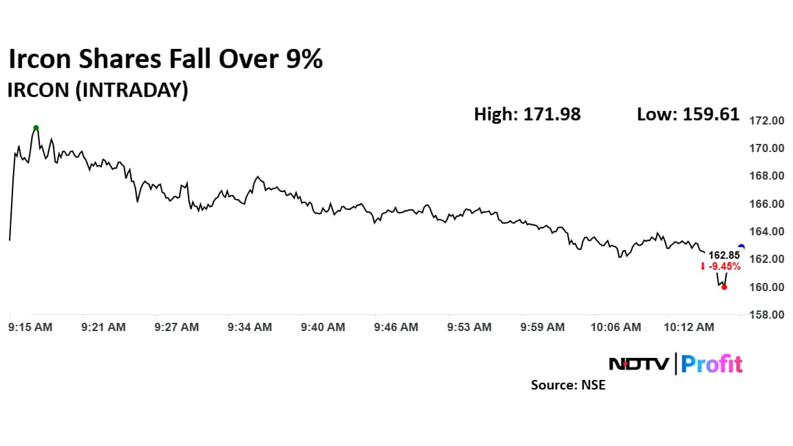Shares of Ircon fell as much as 9.19% to Rs 163.33 apiece, the lowest level since Dec. 21, 2024. They pared losses to trade 8.43% lower at Rs 164.68 apiece, as of 10:12 a.m. This compares to a 0.98% decline in the NSE Nifty 50.