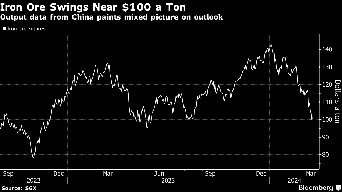 (Bloomberg) -- Iron ore went on a roller-coaster ride, initially sinking well below $100 a ton only to flip higher following Chinese data that painted a mixed picture on steel demand.