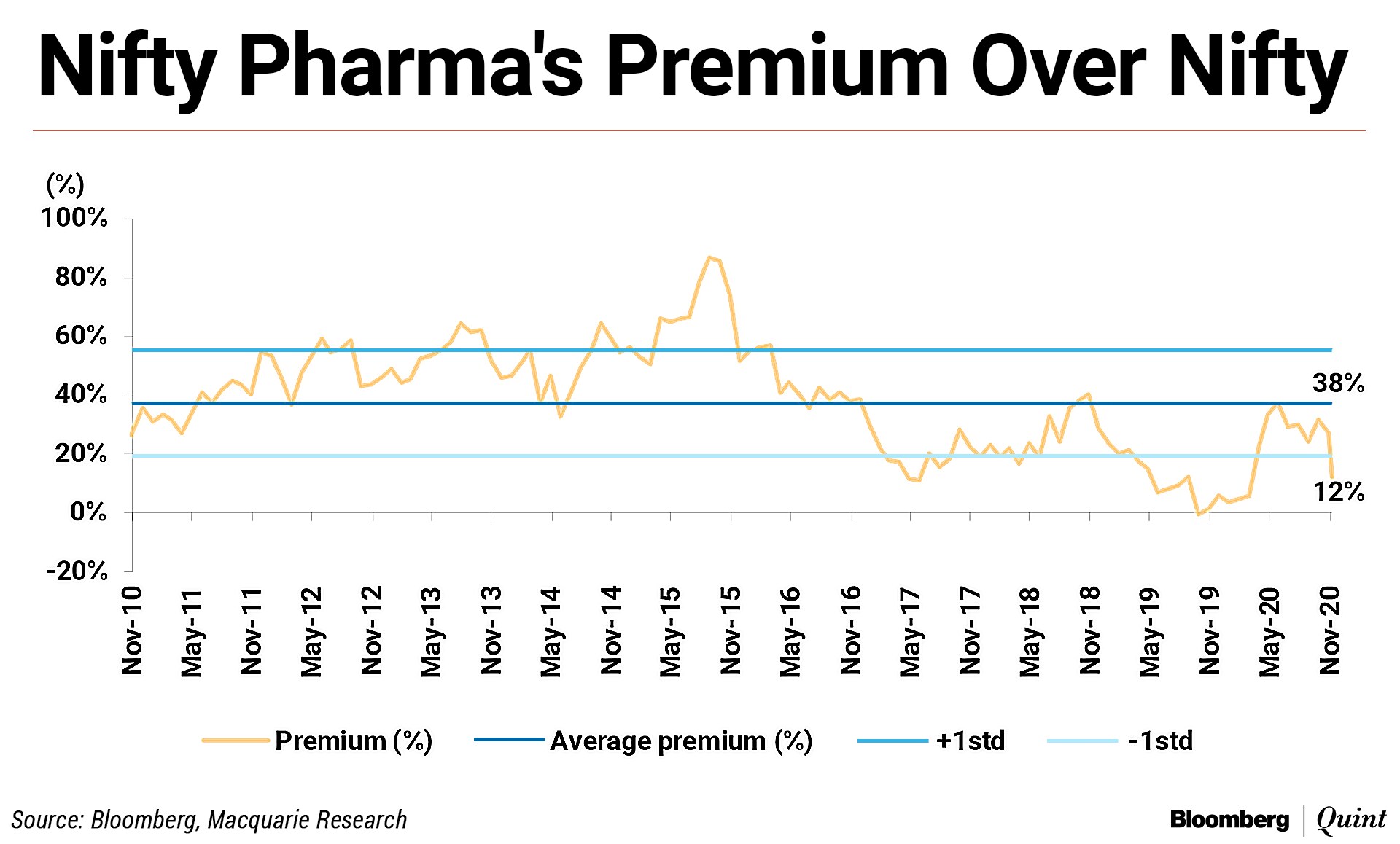 The sector premium to the broader market is much lower than historic levels despite more than 40% gains for the index this year, the brokerage said in a note. Over the last decade, the Nifty Pharma index has traded at a 38% premium to Nifty 50. The premium, according to Macquarie, currently stands at 12%.