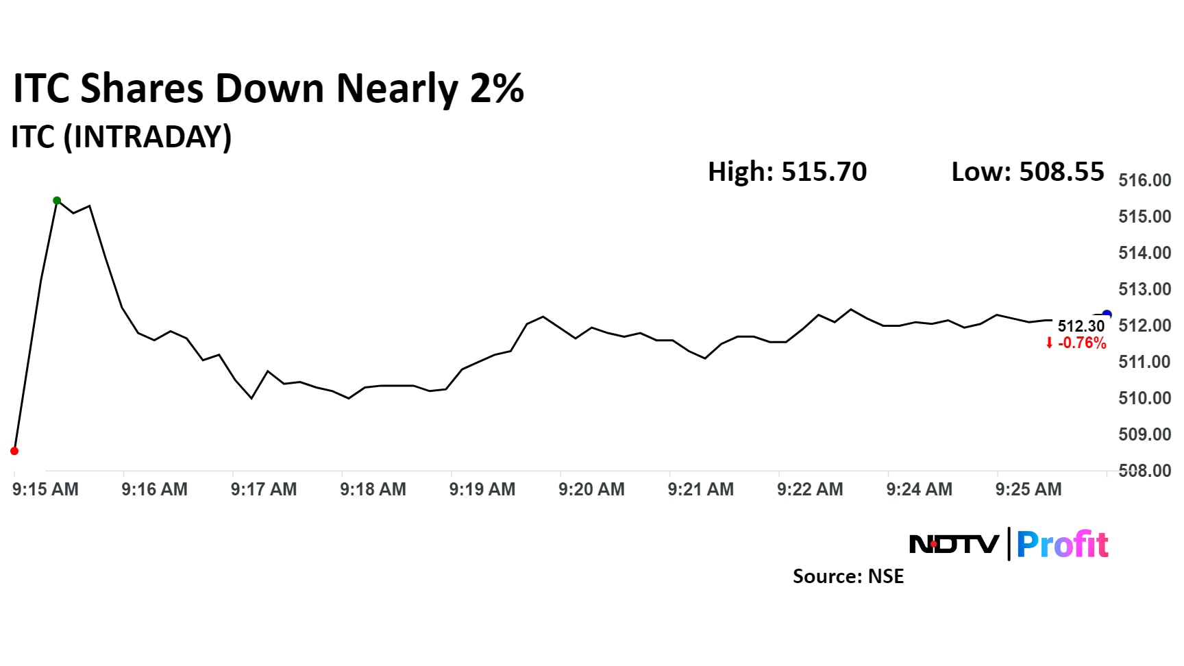ITC Ltd. stock fell as much as 1.48% during the day to Rs 508.55 apiece on the NSE amidst a broader market decline. It was trading 0.91% lower at Rs 511.50 apiece, compared to a 1.02% decline in the benchmark Nifty 50 as of 9:22 a.m.