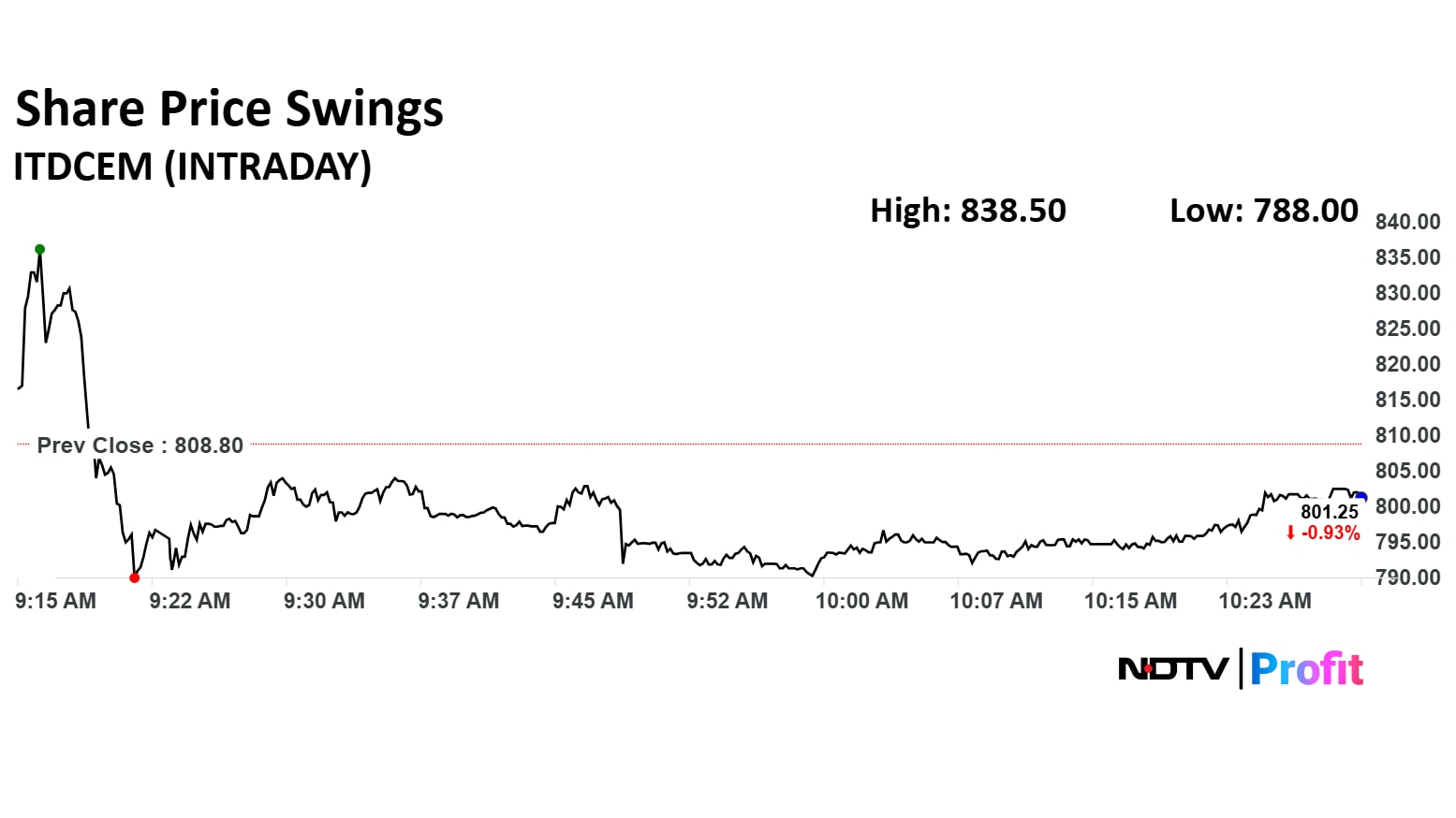 The scrip rose as much as 3.67% to Rs 838.50 apiece, but it later gave up all gains to decline 0.88% to trade at Rs 801.70 as of 10:34 a.m. This compares to a 0.91% decline in the NSE Nifty 50.