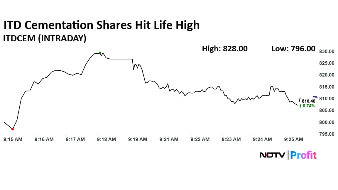 The shares of ITD Cementation rose as much as 9.33% to Rs 830 apiece and hit a fresh life high since its listing in 1998. It pared gains to trade 8.90% higher at Rs 826.75 apiece, as of 9:19 a.m. This compares to a 0.10% advance in the NSE Nifty 50 Index.