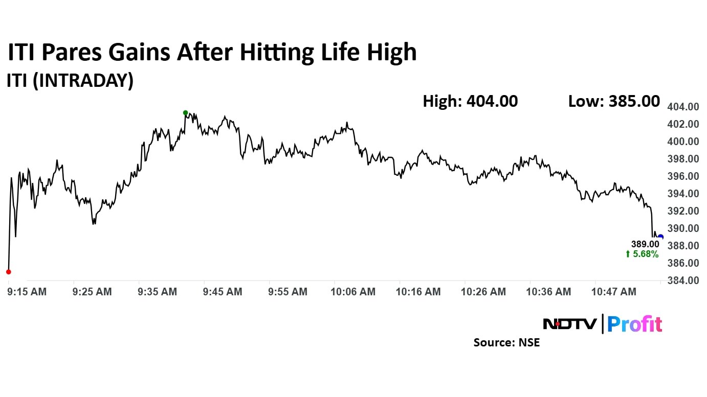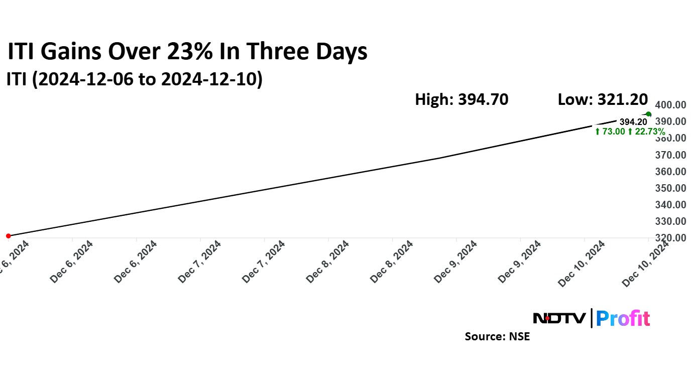 On Tuesday, ITI share price jumped nearly 10% to record high of Rs 404.00 apiece. It was trading 7.65% higher at Rs 396.40 apiece as of 10:45 a.m., as compared to a 0.04% advance in the NSE Nifty 50.