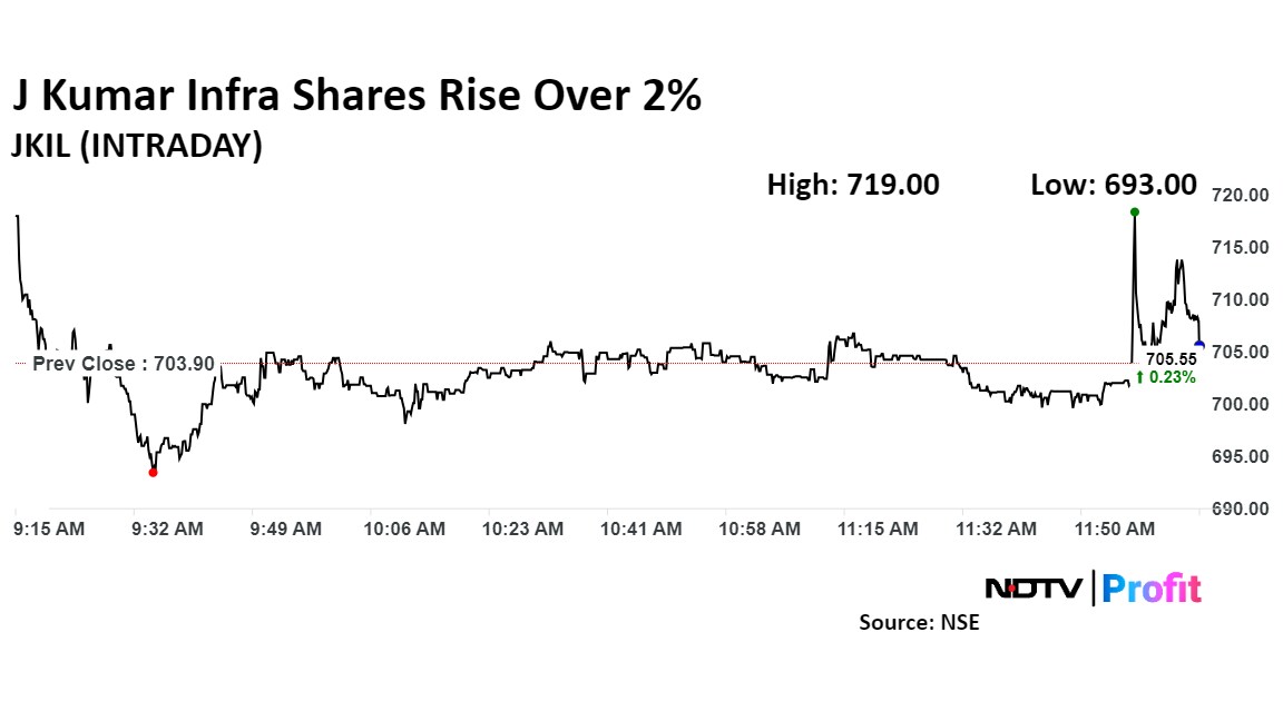 J Kumar Infraprojects Ltd. shares rose over 2% after it received a Letter of Acceptance by NBCC (India) Ltd. for a group housing project worth Rs 1,073.39 crore. The project also includes operation and maintenance for a period of two years.