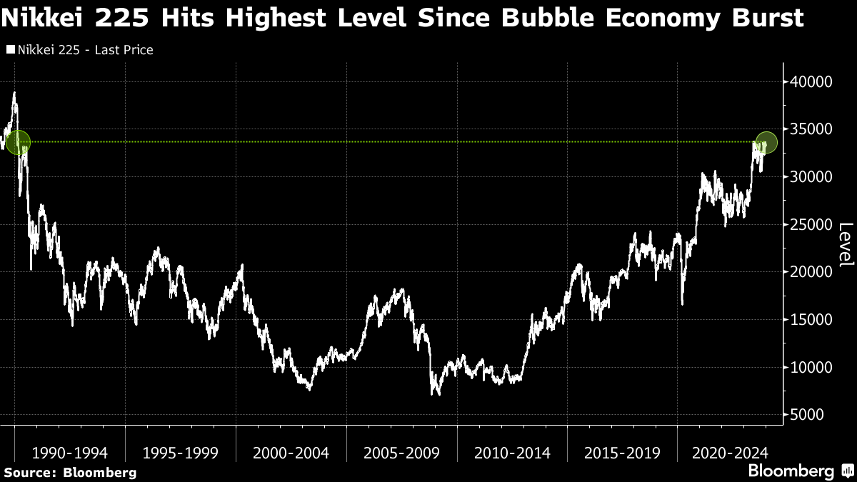 (Bloomberg) -- Japan's Nikkei 225 Stock Average climbed to its highest since the nation's bubble economy era more than three decades ago, reflecting investor optimism that growth is returning after the country's long battle with deflation.
