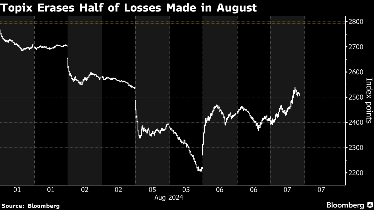 Still, the market remains unstable amid volatile conditions that sent the equity gauges into bear markets on Monday. The Nikkei 225 and the Topix are down about 15% from highs hit last month, after sliding into a bear market on Aug. 5 when losses exceeded 20%. The Nikkei's implied volatility touched its highest level since 2008 at the start of the week.