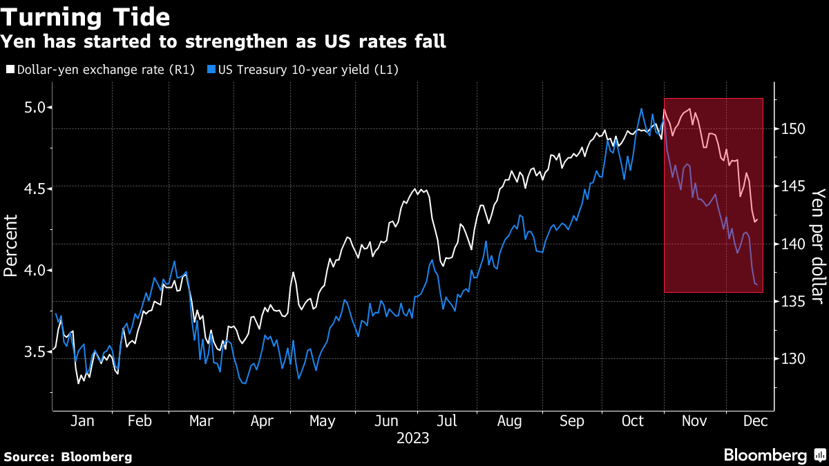 “It does seem that bond yields have now peaked, the Fed has finished hiking and the dollar has further to fall in 2024,” said Kit Juckes, chief foreign-exchange strategist at Societe Generale in London. “The yen should make substantial gains.”