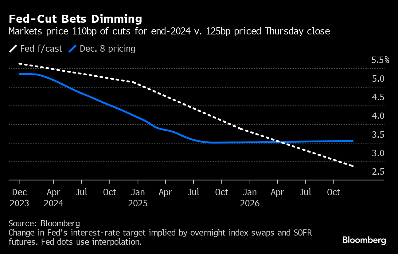 Softening inflation and employment data in the past month have convinced investors that the Fed is done raising interest rates and ignited bets that cuts of at least 125 basis points of cuts were in store over the next 12 months. Traders scaled back those wagers to about 110 basis points of easing.